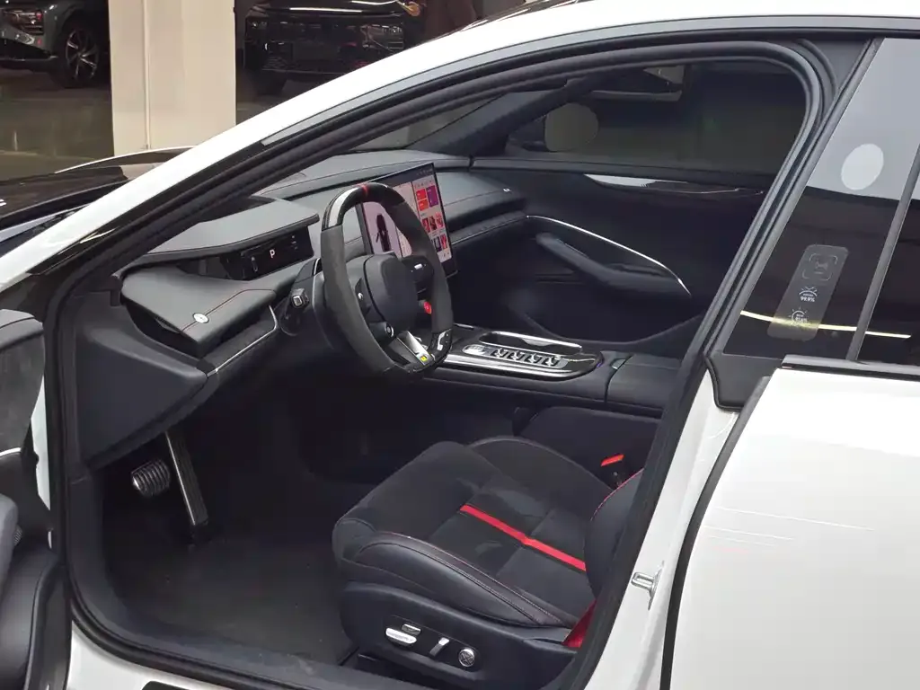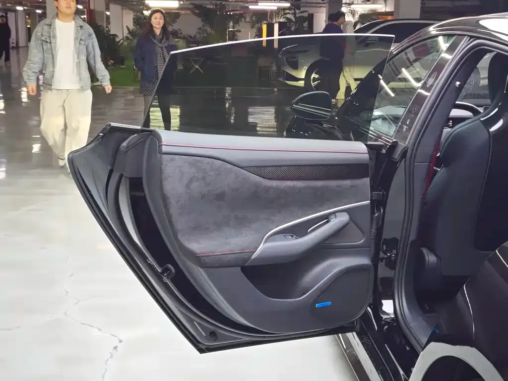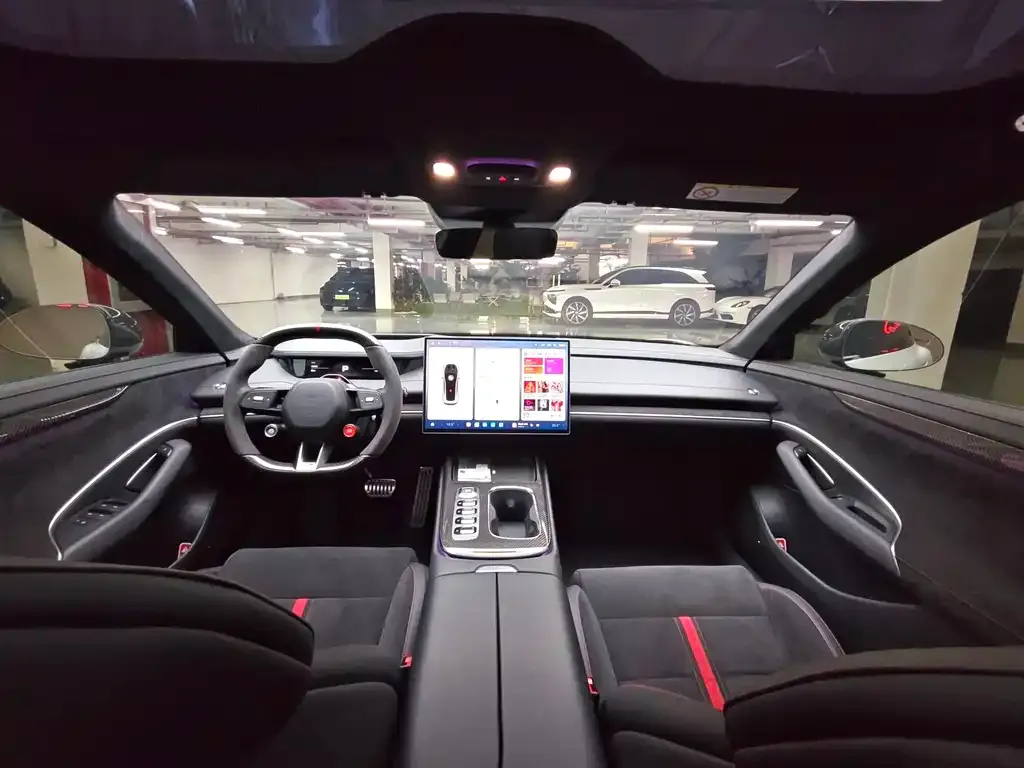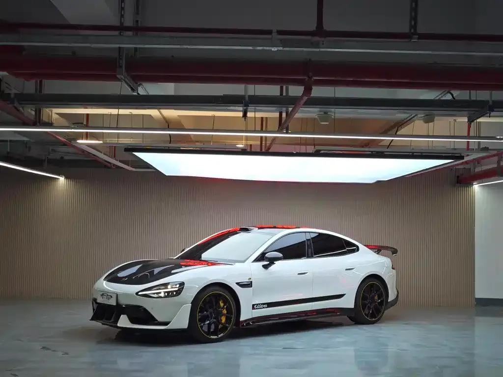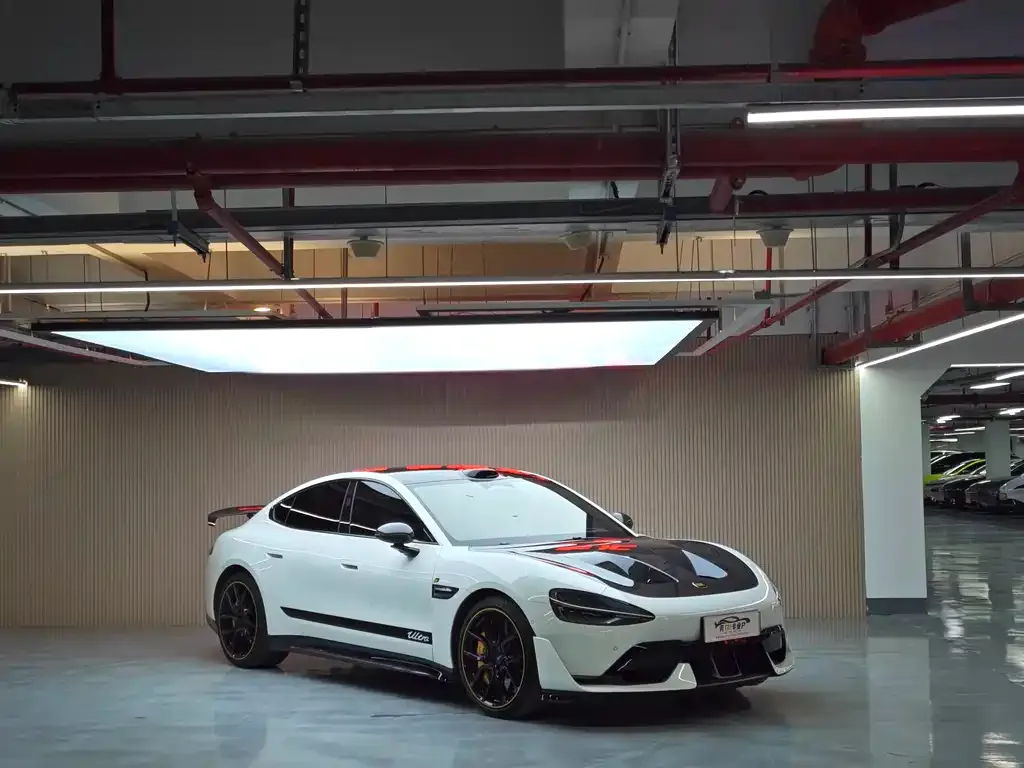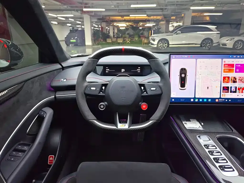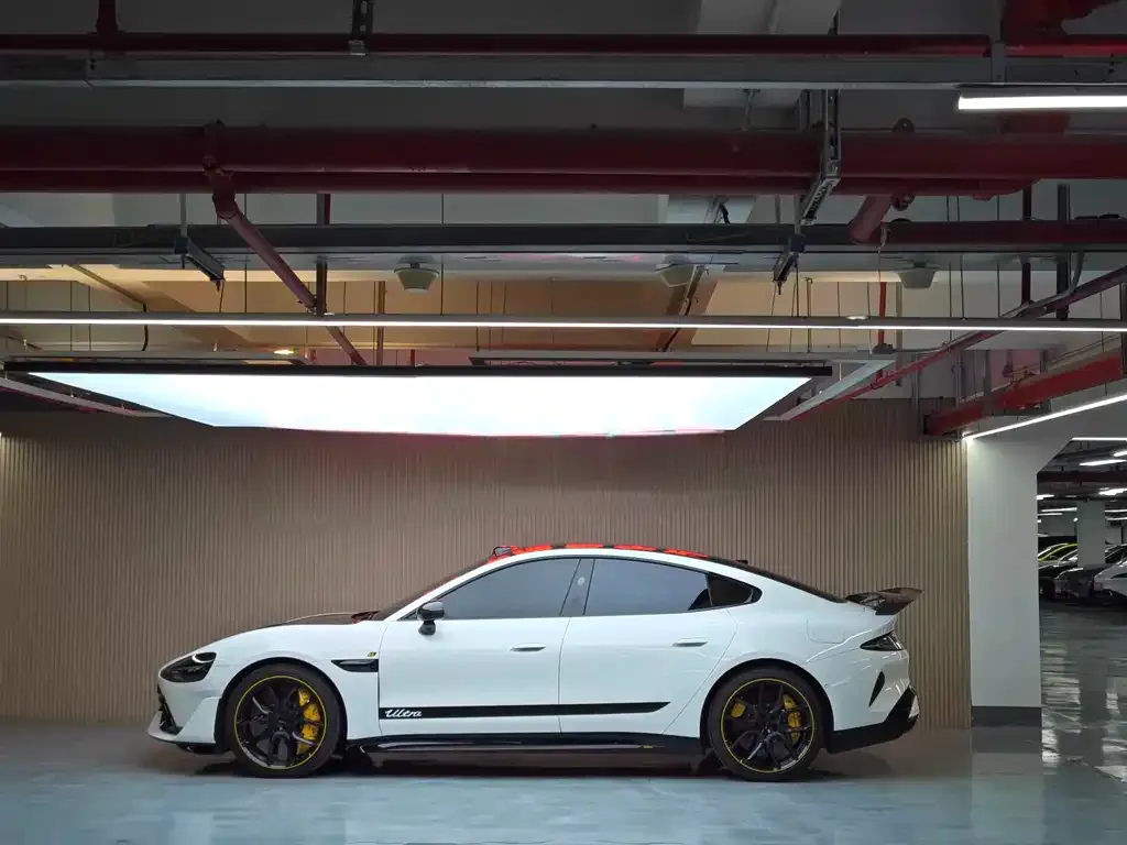 Версия Ультра (Ultra) в линейке Сяоми СЮ7 (Xiaomi SU7) является максимальной по уровню оснащения и включает практически все доступные технологии и системы. Интерьер отделан премиальными материалами: кожа Наппа (Nappa), алькантара (Alcantara) и карбоновые вставки создают атмосферу, характерную для автомобилей значительно более высокого ценового сегмента. Центральный дисплей большой диагонали работает под управлением операционной системы Сяоми ХайПер-ОС (Xiaomi HyperOS), обеспечивая глубокую интеграцию со смартфонами и другими устройствами экосистемы Сяоми (Xiaomi). Система помощи водителю второго уровня плюс (L2+) включает адаптивный круиз-контроль, удержание в полосе, автоматическое торможение и функцию автопилота на трассе. Аудиосистема премиум-класса от известного производителя акустики обеспечивает высококачественное звучание в салоне. Версия Ультра (Ultra) оснащается панорамной крышей с электрохромным затемнением, системой вентиляции и обогрева сидений на всех рядах, а также массажными функциями для передних кресел. Система бесключевого доступа и запуска, цифровой ключ на смартфоне и функция удалённого управления через приложение Сяоми (Xiaomi) входят в стандартное оснащение версии Ультра (Ultra). Система ночного видения и проекционный дисплей (Хэд-ап дисплей / HUD) проецируют важную информацию на лобовое стекло, минимизируя отвлечение водителя.