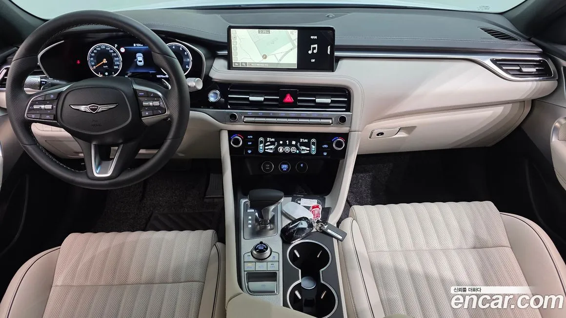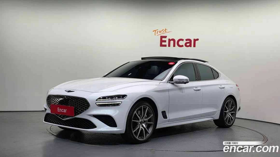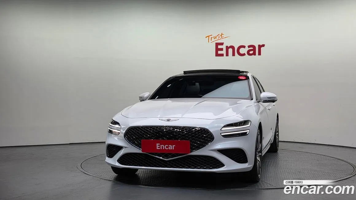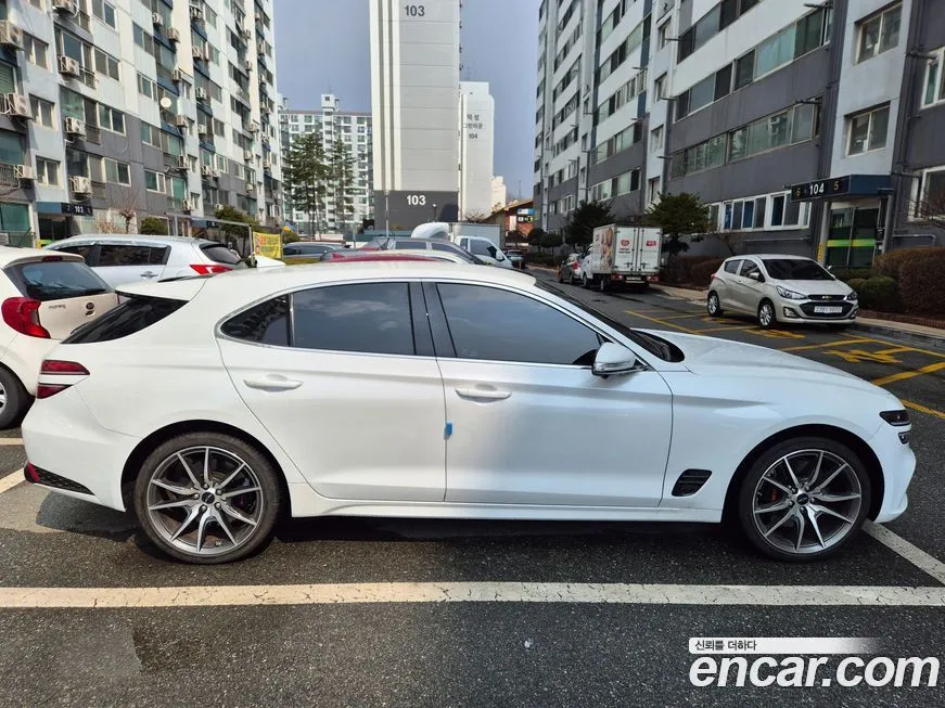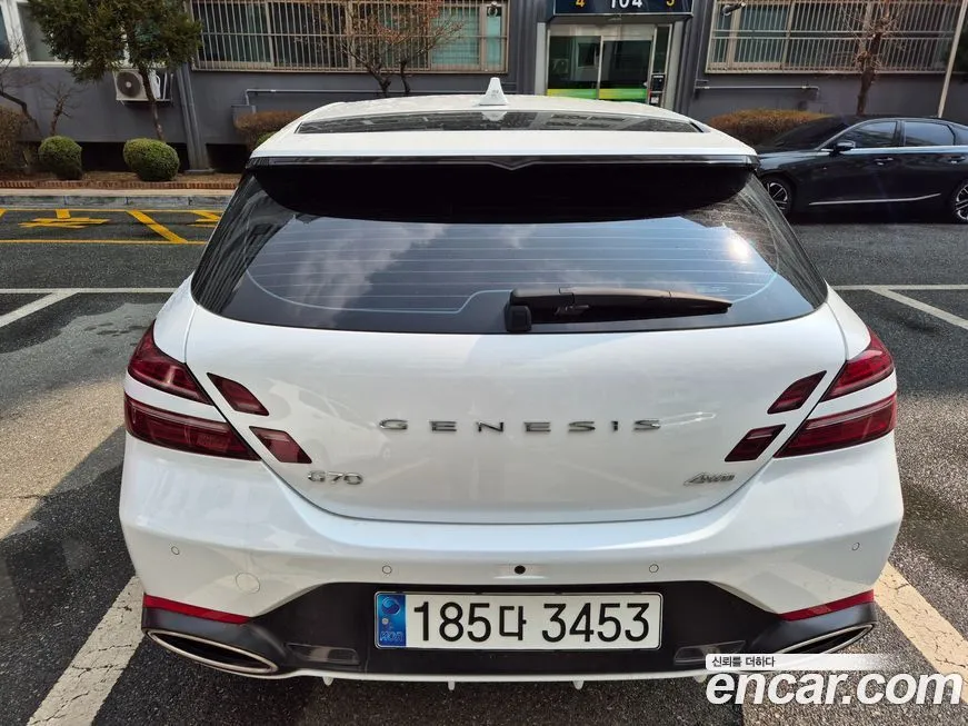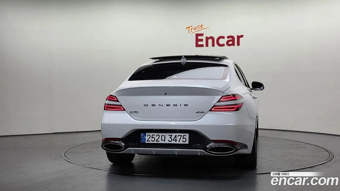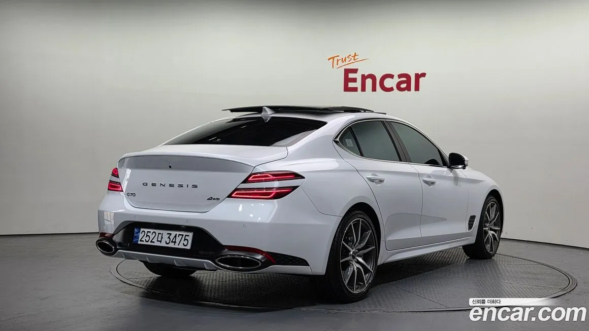 Версия Дженезис Джи 70 Бензин 2.5 Турбо полный привод (Genesis G70 Gasoline 2.5T 4WD) для корейского рынка традиционно предлагается в нескольких уровнях оснащения - от базового до максимального, включающего расширенный пакет технологий. В стандартное оснащение, как правило, входят светодиодная оптика (LED) спереди и сзади, цифровая приборная панель, мультимедийная система с сенсорным дисплеем диагональю от 8 до 10.25 дюймов, поддержка беспроводного подключения смартфона. Система безопасности включает адаптивный круиз-контроль, систему удержания в полосе, предупреждение о столкновении с автоматическим торможением, мониторинг слепых зон и систему помощи при выезде задним ходом. Интерьер отделан кожей наппа (Nappa) в топовых исполнениях, предусмотрены вентиляция и подогрев передних сидений, подогрев руля и задних сидений. Аудиосистема Лексикон (Lexicon) с множеством динамиков доступна в расширенных комплектациях и считается одним из преимуществ модели. Система полного привода (4ВД) дополнена электронной блокировкой дифференциала и режимами движения: комфорт (Comfort), спорт (Sport), спорт плюс (Sport+) и индивидуальный (Individual). Панорамная стеклянная крыша, проекционный дисплей (HUD) и система навигации с обновлением карт в режиме реального времени также входят в расширенный пакет оснащения. Внешне версия с полным приводом (4ВД) практически не отличается от заднеприводной, однако может иметь специфические обозначения на кузове и иной профиль шин.