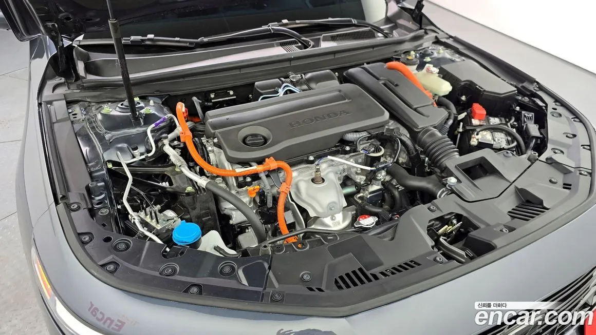 В основе Хонда Аккорд 2.0 Гибрид Туринг (Honda Accord 2.0 Hybrid Touring) лежит фирменная двухмоторная гибридная система Хонда Спорт Гибрид Интеллидженс Мульти Моуд Драйв (Honda Sport Hybrid i-MMD), которая сочетает атмосферный бензиновый двигатель объёмом 2.0 литра с двумя электромоторами. Бензиновый мотор относится к циклу Аткинсона (Atkinson), что обеспечивает повышенный термический коэффициент полезного действия и снижение расхода топлива. Суммарная системная мощность гибридной установки составляет в зависимости от рынка порядка 215 лошадиных сил, что обеспечивает уверенную динамику для автомобиля данного класса. Разгон до 100 километров в час занимает ориентировочно около 7 секунд, что является достойным результатом для гибридного седана бизнес-класса. Трансмиссия - электрически управляемый вариатор (е-СВТ / e-CVT), который в большинстве режимов работает как прямой электрический привод, подключая бензиновый двигатель по мере необходимости. Привод - передний (2ВД / 2WD), что характерно для данной модели на корейском рынке. Средний комбинированный расход топлива по данным производителя составляет в районе 4.5-5.5 литра на 100 километров в зависимости от условий эксплуатации и режима движения. В реальных городских условиях расход может быть ещё ниже за счёт рекуперации энергии торможения. Аккумуляторная батарея литий-ионного (Li-Ion) типа расположена под задним сиденьем, что позволяет сохранить полноценный объём багажника. Колёсная база Хонда Аккорд (Honda Accord) одиннадцатого поколения составляет около 2830 миллиметров, что обеспечивает просторный салон. Общая длина кузова достигает приблизительно 4900 миллиметров, ширина - около 1860 миллиметров, высота - около 1450 миллиметров. Объём багажного отделения составляет в зависимости от версии около 430-473 литров - конкурентный показатель для класса. Подвеска - независимая спереди типа МакФерсон (MacPherson) и многорычажная (мультилинк / multi-link) сзади, что обеспечивает баланс между управляемостью и комфортом. Тормозная система - дисковая на всех четырёх колёсах с антиблокировочной системой АБС (ABS) и электронным распределением тормозных усилий.