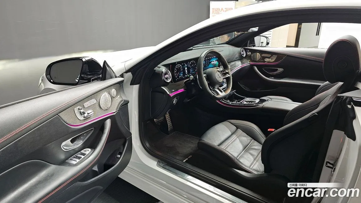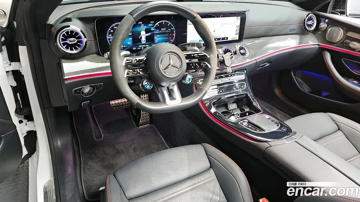 Версия Мерседес-Бенц (Mercedes-Benz) Е53 АМГ 4МАТИК+ (E53 AMG 4MATIC+) для корейского рынка традиционно поставляется в богатой базовой конфигурации, включающей двойной 12,3-дюймовый дисплей системы МБУКС (MBUX - Mercedes-Benz User Experience), объединённый в единый экранный блок. Мультимедийная система МБУКС (MBUX) поддерживает голосовое управление с функцией распознавания естественной речи, что является важным преимуществом на корейском рынке. Панорамная крыша с электроприводом, система кругового обзора, матричные светодиодные (LED) фары с функцией адаптивного освещения входят в стандартное оснащение. Интерьер отличается отделкой из натуральной кожи Наппа (Nappa) с прострочкой в стиле АМГ (AMG), алюминиевыми или карбоновыми (carbon) вставками в зависимости от выбранного пакета. Спортивные сиденья АМГ (AMG) с развитой боковой поддержкой и функцией массажа обеспечивают комфорт в дальних поездках. Система активной безопасности включает адаптивный круиз-контроль с функцией полуавтономного движения в пробках, систему предотвращения столкновений, контроль полосы движения и распознавание дорожных знаков. Аудиосистема Бурместер (Burmester) 3Д (3D) с несколькими динамиками является опцией или входит в базовую комплектацию в зависимости от конфигурации. Система беспроводной зарядки смартфона, подключение по протоколам Эпл КарПлей (Apple CarPlay) и Андроид Авто (Android Auto) также предусмотрены. Климатическая система на три зоны, вентиляция и подогрев сидений переднего и заднего ряда, подогрев руля дополняют комфортный пакет версии для корейского рынка.
